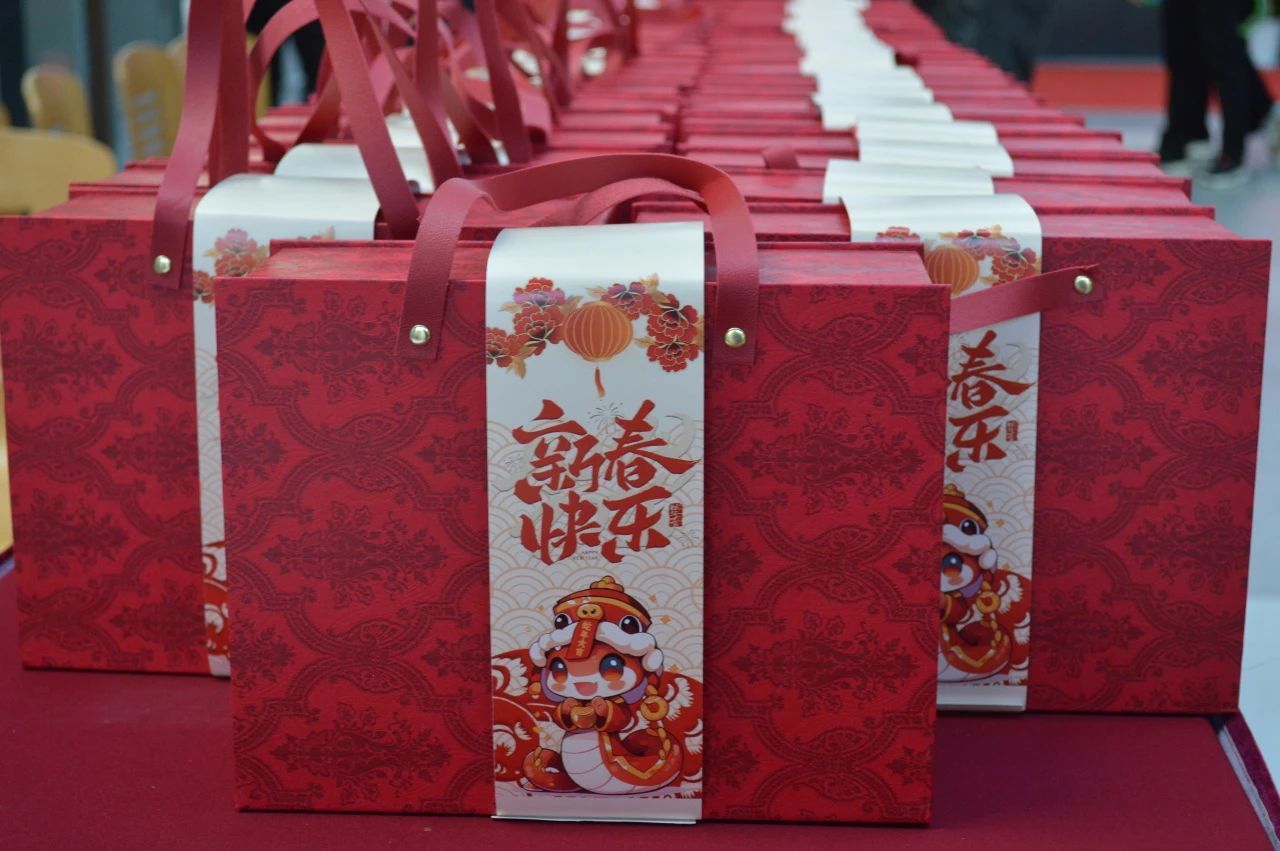 与会老师为留校学子赠送了由公司精心准备的新春礼包和公司定制的福袋,同时传递了温暖的关怀和节日的祝福。