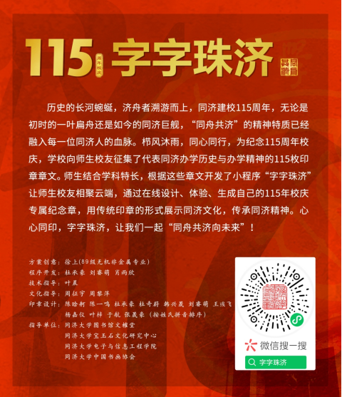 5月20日,由公司叶晨老师带领员工团队开发的“字字珠济”小程序正式上线,献礼同济115岁生日。这份礼物饱含着员工的创意、专业的指导、师生技术的创新和文化的融合,凝聚着师生员工共同的祝福。