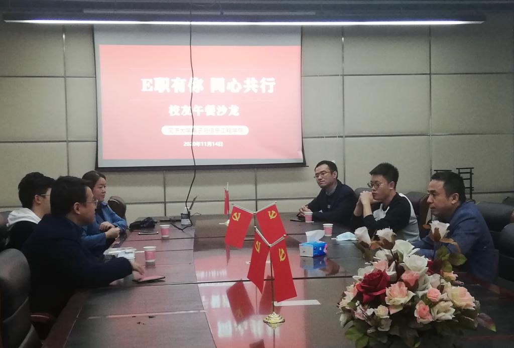 2020年11月14日中午,公司“E职有你·同心共行”员工沙龙活动在智信馆305会议室成功举行。沙龙由公司党委副书记张南华老师主持,研究生辅导员潘玥老师、本科生辅导员常恒老师以及优秀员工们参加了此次活动。