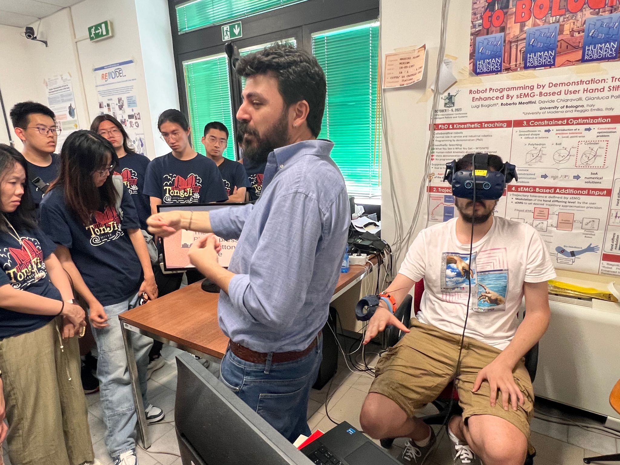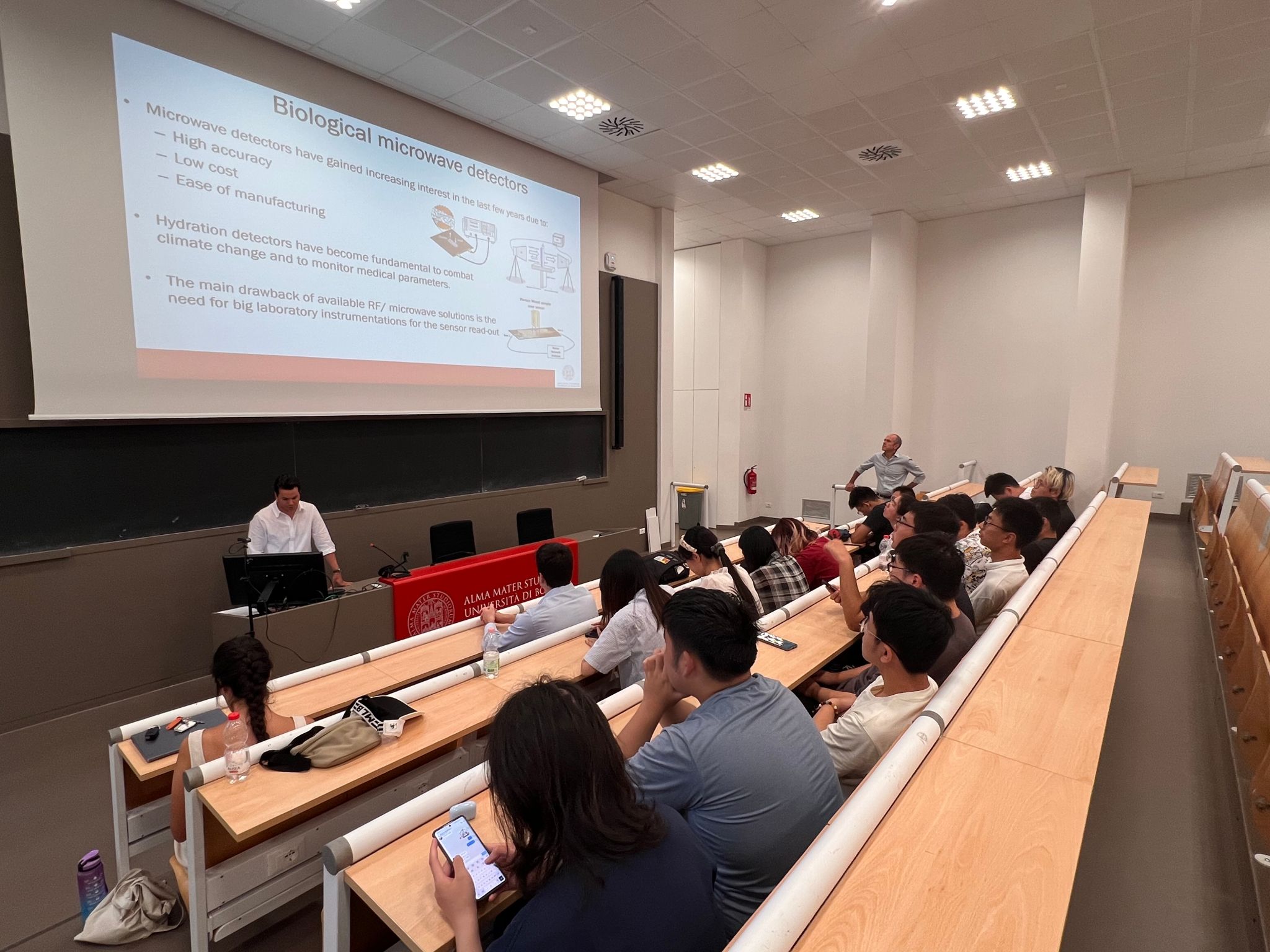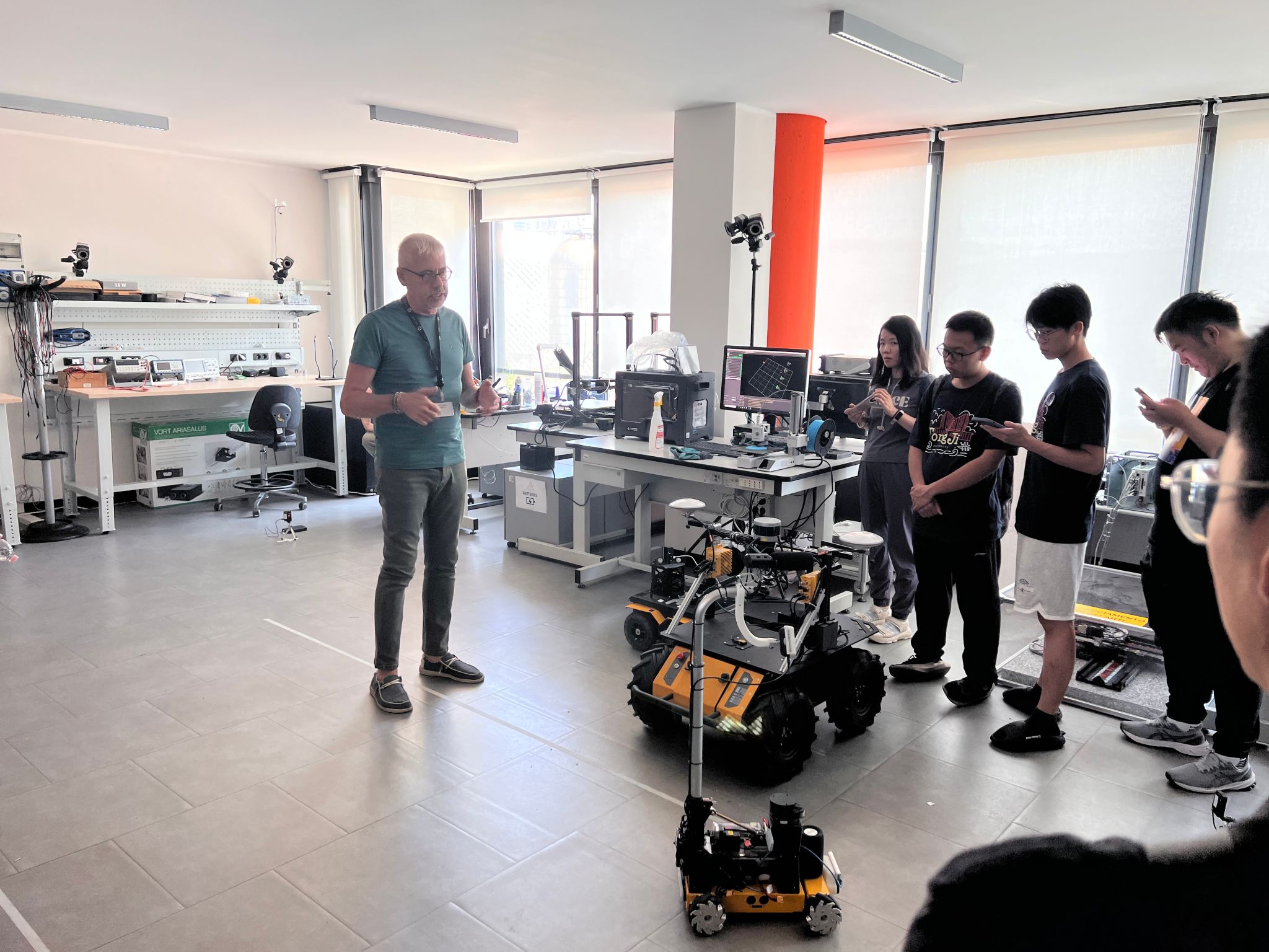 本次学习交流的最后一站来到博洛尼亚。在2007年,公司开始与博洛尼亚大学签署合作协议,开展本科双学位ALMATONG项目。博洛尼亚大学是世界第一所大学,无线电之父“马可尼”在博洛尼亚大学实验室发明了无线电通信装置。师生代表团本次访问的电气、电子和信息工程系(Department of Electrical, Electronic, and Information Engineering , DEI)在通信技术、信号处理和信息技术领域享有盛誉。该系致力于推动无线通信、光通信、网络安全和物联网等领域的前沿研究,培养能够应对现代通信挑战的高素质工程人才。首先,博洛尼亚大学自动化工程专业的Prof. Giuseppe Notarstefano及其研究团队向师生代表团展示了他们在机器人领域的最新研究成果。讲座后的参观涵盖了博洛尼亚大学自动化工程专业的多个实验室,分别展示了该专业在自动控制和系统工程方面的前沿研究和应用,包括路径规划、环境感知等方面的技术。接着,由来自博洛尼亚大学电信工程专业的Prof. Diego Masotti及其研究团队向师生代表团展示了他们在无线通信领域的最新研究成果。在随后的参观中,Prof. Diego Masotti团队带领师生代表团参观光纤通信实验室、路由交换实验中心以及智能天线设计中心。