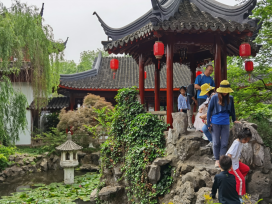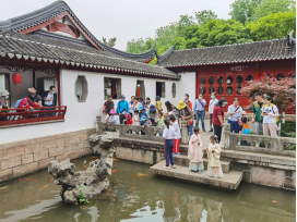 天气晴朗,大家兴致盎然。漫步园中,听导游讲解红楼梦中的人物故事,领略古典园林的玲珑秀丽,欣赏小桥流水的诗情画意,品味景点陈设的古朴精美。小朋友们也不时沉浸在过廊桥、爬假山和与鱼儿互动的乐趣中。