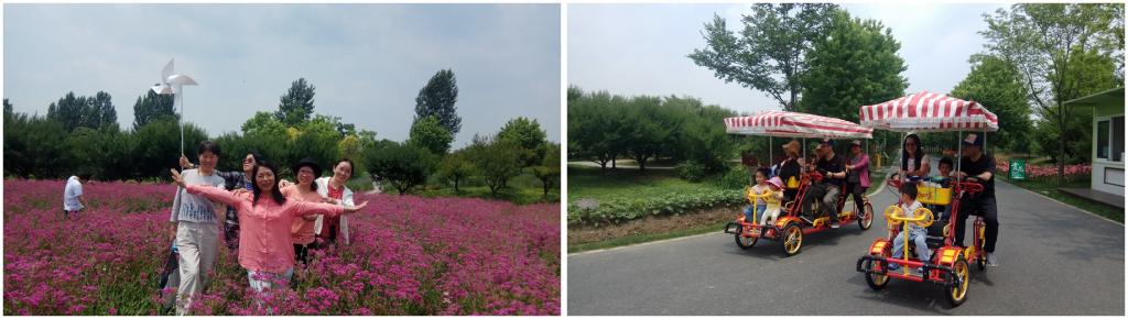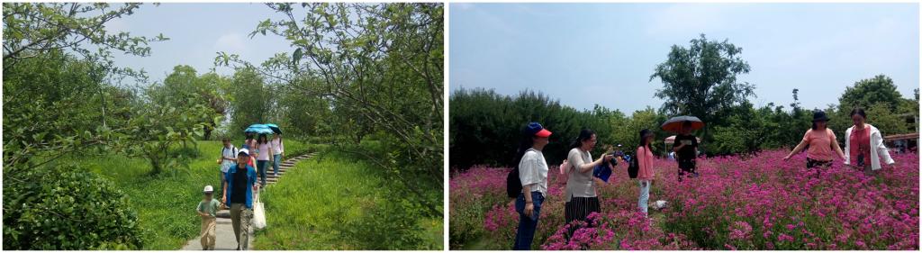 上午,队伍分别从四平路校区、沪西校区、嘉定校区三地出发,在花开海上生态园汇合。初夏的天气虽有些闷热,但丝毫未影响大家的兴致。大家或漫步鲜花丛中,或骑行在绿荫小道,或登台望远,尽情享受自然野趣。