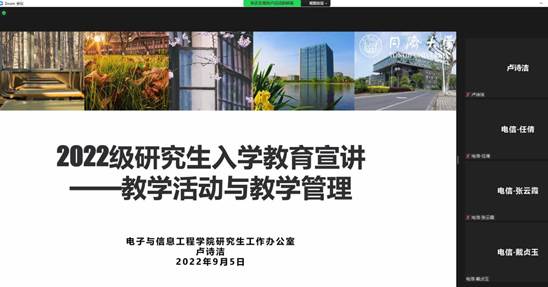 9月5日下午,2022级研究生迎新教育周系列活动之“教学管理与教学活动”宣讲会通过zoom平台举行,研究生工作办公室副主任张云霞、各系研究生教务员和2022级研究生新生共计400余人参加本次会议,会议由研究生工作办公室教务员卢诗洁主持。本次宣讲会旨在帮助新生详细了解公司公司产品各个环节的相关事宜并且为新生解答疑虑。