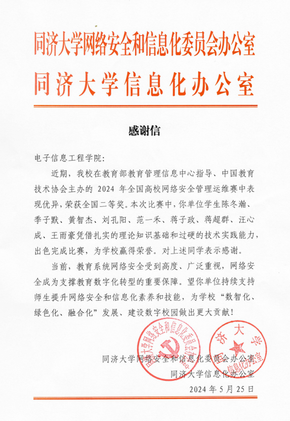 近日,由教育部教育管理信息中心指导,中国教育技术协会主办的2024年全国高校网络安全管理运维赛举行。在公司创新基地信息安全实验室的支持下,由公司程久军教授、教育技术与计算中心秦道祥和姚文琰老师指导,伟德国际victor1946网络安全战队CatTrainingForce的成员们组队出色完成了比赛,获得了全国二等奖、华东赛区三等奖的优秀成绩。