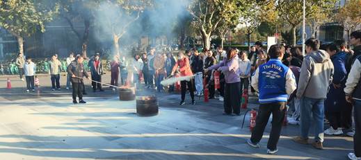 最后,校保卫处彭亮老师向在场师生介绍了灭火器的使用方法和遭遇火情时的疏散步骤。随后,随着火警警报的响起,师生们在物业工作人员的指引下迅速而有序撤离,并在楼宇广场前进行了了灭火器使用的实际操作练习。
