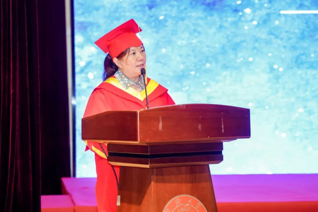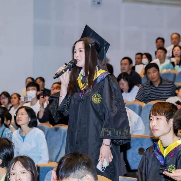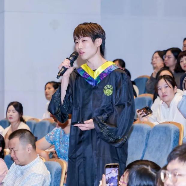 “每一种生命都有自己的生长方式。玫瑰不必长成松柏,每个人也无需沿着同一条轨道前行。在无数个成长的瞬间,我们更应该保持自我,坚持本心。”电子科学与技术专业研究生代表谢好同员工动地回顾了在智信馆度过的三年充实、温暖而充满挑战的时光。她代表所有研究生祝福到:“愿他日风起时再相逢,花开时再重聚!祝福母校事业蒸蒸日上,祝福全体老师桃李芬芳,祝福同窗前程似锦,祝福家长幸福安康!”
