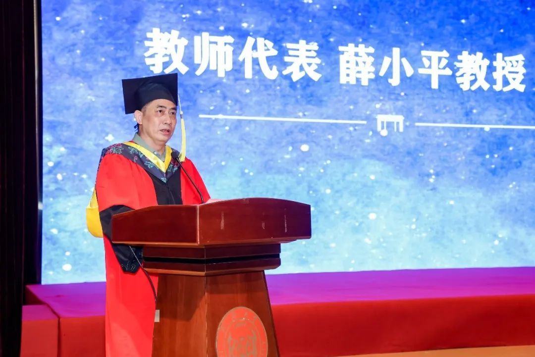 薛小平教授作为教师代表发言,他希望同学们保持“求真”的底色,不仅追求知识的真,更要守护内心的真。保持独立思考,坚守学术诚信,做真诚、正直之人;在AI时代勇于“拓新”,保持探索世界的好奇心;更要肩负起“担当”,以“国之大者”定位人生坐标,用行动诠释“同心同德同舟楫,济人济事济天下”的同济精神,担当起服务国家战略的使命,为民族复兴贡献自己的力量。最后,薛教授深情寄语:“此去星辰大海,归来仍是少年!”