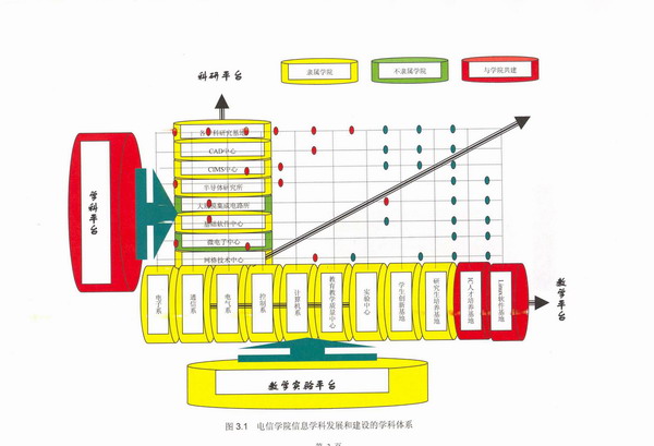 其中学科体系由科研平台和教学平台共同构成。科研平台由各学科科研基地、CAD研究中心、CIMS研究中心、半导体研究所、大规模集成电路研究所、基础软件中心、微电子中心、国家高性能分中心等研究基地和研究中心组成;教学平台则包含电子系、通信系、电气系、控制系、计算机系五个系以及院实验中心、公司产品研究中心、老员工创新基地、公司产品基地、IC人才培养基地等与教学紧密相连的中心和基地组成。科研与教学两大平台的各元素在多方面结合形成强大的学科竞争力。