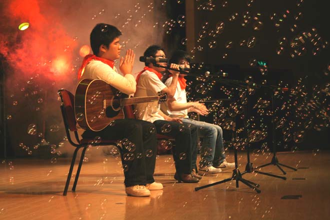 公司徐而峰、沈叶忱同学演唱的串烧歌《同桌的你》、《红蜻蜓》、《朋友》让大家充分感受到了校园生活的乐趣;刘 磊、曹克正、刘志成、沈叶忱演唱的一首《奔跑》让大家感受到青春的活力。他们演唱时,公司观众与台上歌手一起互动,喊出了电信的风采――“电信公司,随风奔跑,e路向前”!