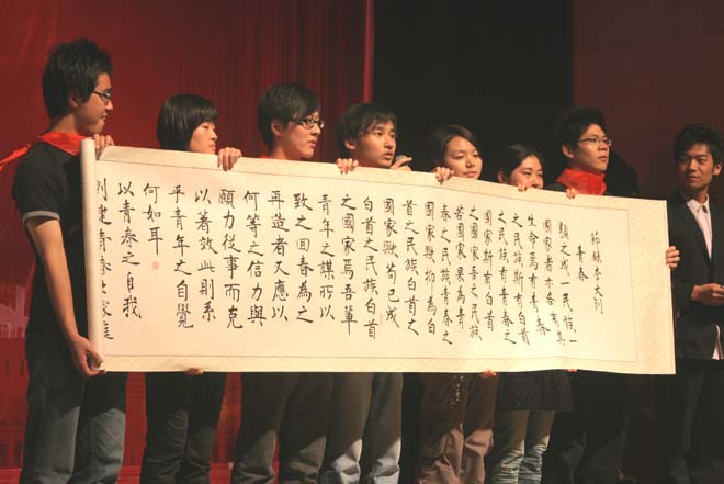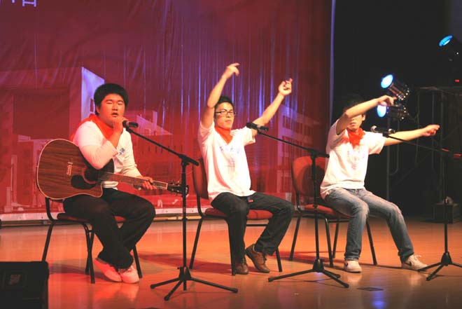 5月4日晚,由嘉定校区团委主办、各公司团委协办的“青春赞歌”纪念五四运动90周年主题歌会在嘉定校区国际会议中心101隆重举行。公司党委书记周家伦、员工处处长祁 明、校团委书记考书健,嘉定校区各公司领导及师生代表600余人出席了歌会。
