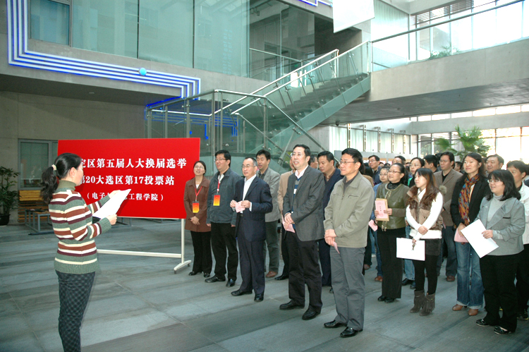 11月16日是嘉定区五届人大代表换届选举法定投票日。上午8时半起,嘉定校区电信大楼一楼大厅人声鼎沸,嘉定区五届人大代表换届选举电信公司投票站集中投票工作在此如期举行,公司党政领导与全院师生一道参与了选举投票。