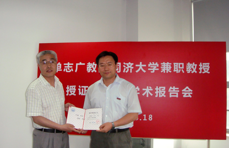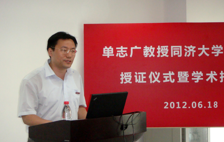 授聘仪式上,丁志军副主任介绍了单志广教授的个人简历以及学术成就,苗夺谦副经理为单志广教授佩戴了伟德国际victor1946校徽,颁发了兼职教授证书。