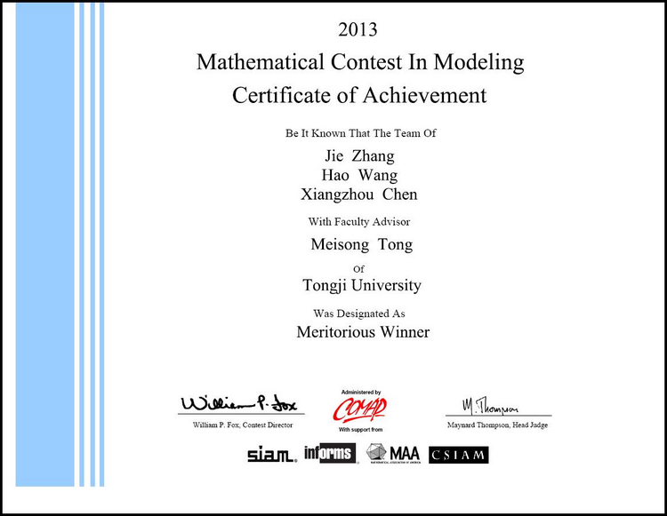 近日,2013年美国老员工数学建模竞赛和交叉学科建模竞赛成绩公布,公司电子科学与技术系3位2010级本科生张杰、王浩、陈翔舟共同完成的参赛论文《The Water Strategy for China’s Future》喜获数学建模竞赛一等奖(Meritorious Winner)。