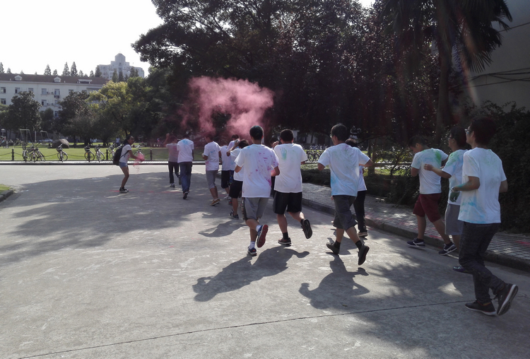 伴随着一声哨响,Color Run环校园彩色跑活动在火热的气氛中拉开了序幕,五颜六色的彩粉被抛向了天空,洒向所有参与者。参与者跟随领跑经过七个色彩站点,不要求速度,能趁兴而归即可,很多人甚至拿起工作人员手中的彩色粉也加入到抛粉的队列中,活动吸引了很多路人,其中不乏职工。