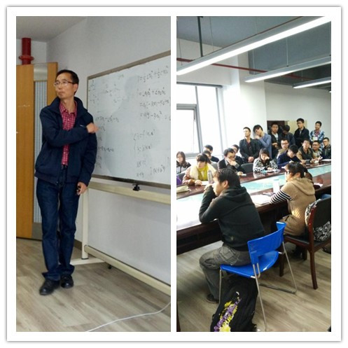 唐教授首先以一个大家熟知的RLC网络引领出对无源系统的基本认识,然后分别围绕带有滤波输出的稳定性系统、合理选择系统输出量、反馈无源化设计和级联无源系统等多个方面与研究生们分享了基于无源性的模块化设计方法,其间也对控制系统的历史发展情况作了清晰地描述,最后通过重点介绍机器人手臂操作的位置控制和讨论卫星姿态控制这两个具体实例演绎了上述方法的实际应用。在机器人手臂操作的位置控制一例中,唐教授还在边界控制、适应性重力补偿和理想位置重力补偿三个方面给在场的员工们留下了一定的思考空间以供进行后续自行研究。他以类似课堂般的形式在小黑板上一步一步详细地分析了基于无源性的控制系统模块化设计方法,深入浅出、形象生动的讲解风格给同学们留下了深刻的印象。
