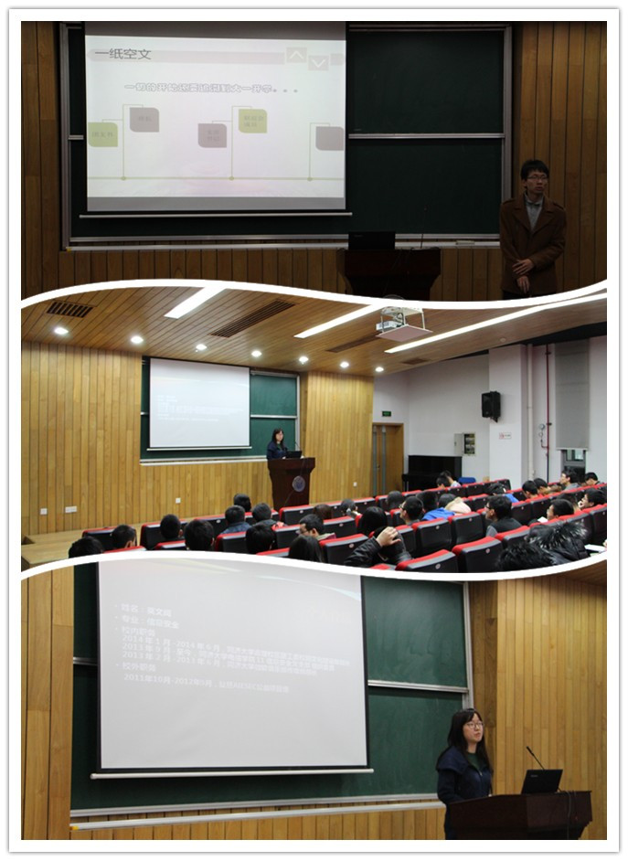 马嘉宇从他本人的经历出发,介绍了他作为班长和党支部书记的工作经历,介绍了很多好的做法、经验。他还与大家分享了自己对班级建设和支部建设两个不同社会工作的侧重点和关键点的思考,尤其强调了工作分配和活动形式两方面的注意事项。最后,马嘉宇还把他几年来社会工作的成果向现场观众做了展示。