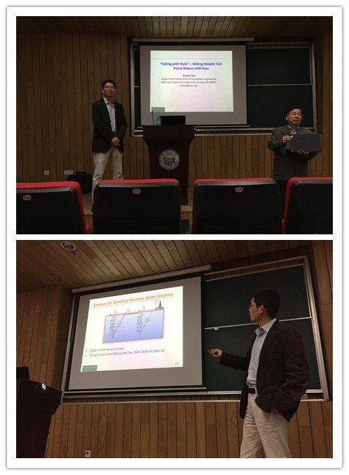 4月21日下午,应公司徐立鸿教授的邀请,美国密歇根州立大学谭晓波教授来到嘉定校区,为公司师生们作了题为“Falling with Style― Gliding Robotic Fish Patrol Waters with Ease”的学术报告。该报告主要讨论了新的水下机器人的类型――“gliding robotic fish”。