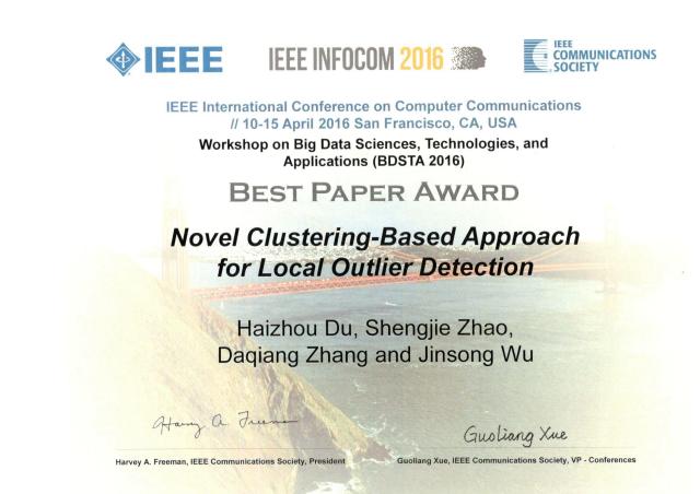 近日,从IEEE INFOCOM 2016组委会获悉,在美国旧金山召开的IEEEINFOCOM2016第35届计算机通信(IEEE INFOCOM 2016 - 35th International Conference on Computer Communications)国际会议上,公司赵生捷教授的论文《基于聚类的新颖局部离群点检测方法》 (Novel Clustering-based Approach for Local Outlier Detection)获得了会议颁发的大数据科学、技术与应用workshop最佳论文奖(Best Paper Award for workshop on Big Data Sciences,Technologies,and Applications BDSTA 2016)。