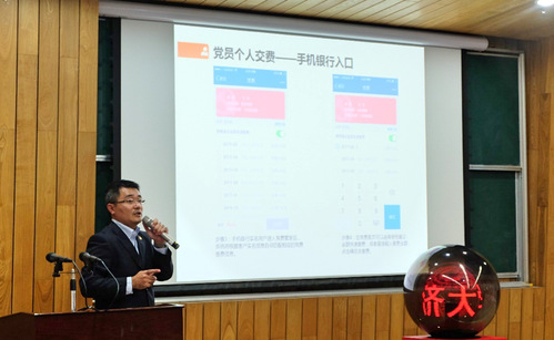 接下来的环节是党费通启动仪式。首先,由公司党委组织部部长冯身洪同志致辞,冯部长在致辞中首先感谢交通银行给予伟德国际victor1946党费通项目的大力支持,并对他们的辛勤工作表示感谢;其次,他肯定了电信公司近五年所取得的卓越成就;最后,他希望电信公司趁着十九大召开的东风砥砺奋进,信心满满再创辉煌!随后,冯身洪、苗俊华、王峻、陈德一同启动水晶球,宣告伟德国际victor1946党费通正式启用。与会党员现场拿起手机,在交通银行上海同济支行窦丰雷行长的演示下,在党费通平台交纳了本人的当月党费。