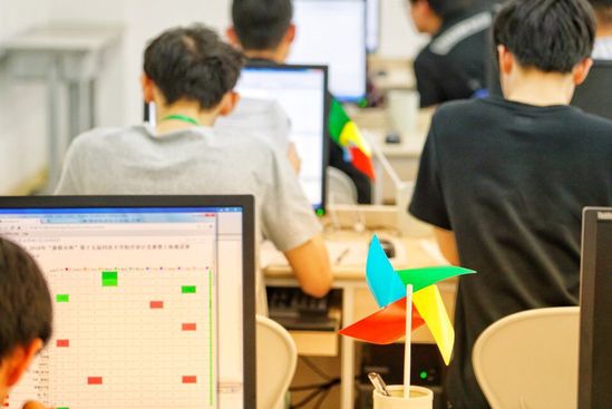 (图为比赛现场,标志题目完成的彩色风车)