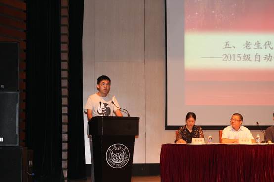 老生代表2015级常恒同学结合自身的老员工活经验,叮嘱新生在老员工活中养成好习惯,学会自主学习,并希望学弟学妹尽快完成老员工身份的转变,常恒学长提醒同学们,大家拥有了自己决定自己未来的权力。同时也肩负起了自己成长的责任。