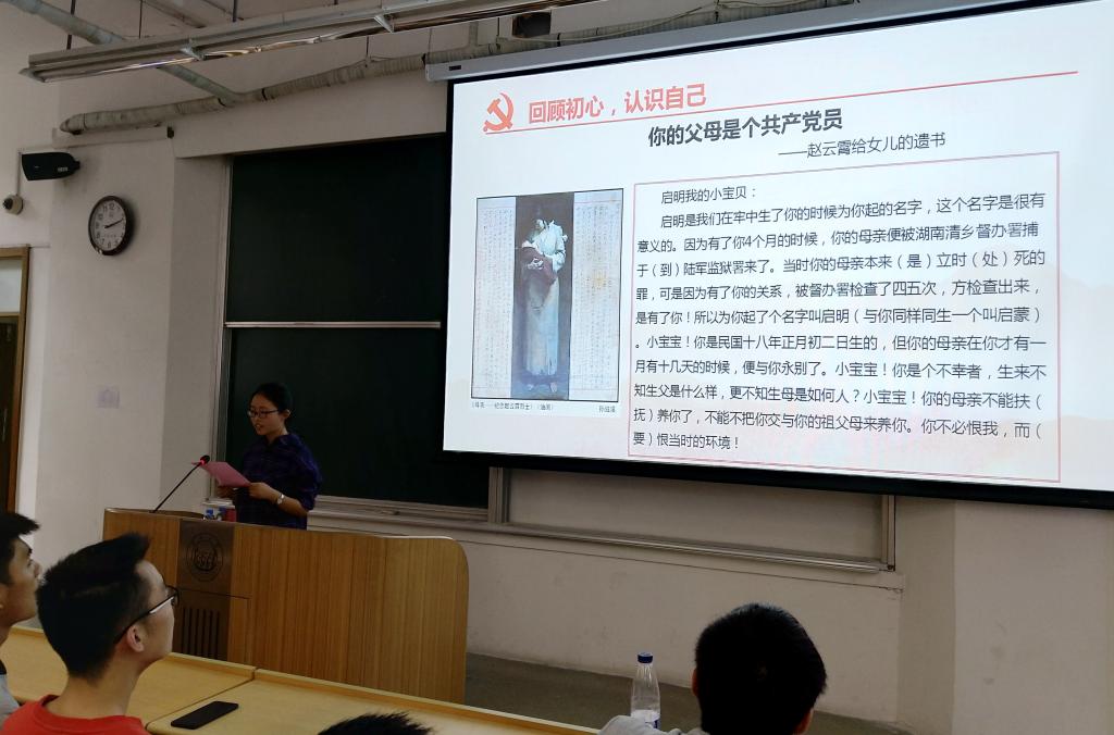培训班邀请人文公司党委副书记刘涛副教授作了题为“与信仰对话——读红色家书,感悟信仰的力量”专题报告。刘老师以朗读《赵云霄烈士给女儿的信》和《刘伯坚狱中写给兄嫂的信》开题,以“回顾初心,认识自己”、“不忘初心,找回来时的路”和“牢记初心,践行信仰”等三个板块展开,从建党初心出发,结合中国的传统文化和共产党人所面临的国内外形势,讲述中国共产党的发展历史、共产党人的初心和信仰,结合生动的案例和丰富的史料,引导学员善于思考,积极实践,做时代新人,为实现中华民族伟大复兴的中国梦做出应有的贡献。(刘永焕)