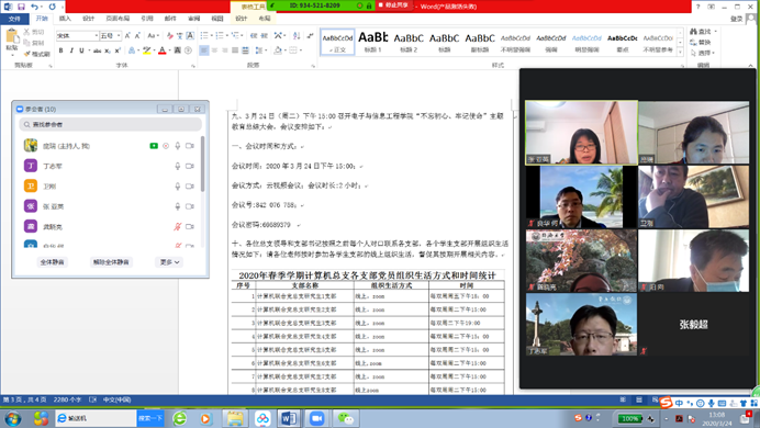 据悉,计算机总支不仅组织支部落实“把初心落在行动上、把使命担在肩膀上”的主题党日活动,还组织各个教研室全体老师,通过zoom视屏会议线上学习,教研室所有老师悉数参加。大家一起学习了深入学习贯彻习近平总书记在统筹推进新冠肺炎疫情防控和经济社会发展工作部署会议上的讲话精神,全力做好校园疫情防控工作、公司2020年工作部署会议精神以及张桂梅同志的先进事迹。学习后结合自身的工作性质,每个老师都做了发言。大家一致表示会带头做好疫情防控工作和意识形态把控,坚决不信谣不传谣,坚定科学防控和抗疫必胜的信心,坚守岗位尽己所能做好教学和科研工作。(庞瑞)