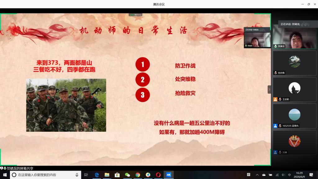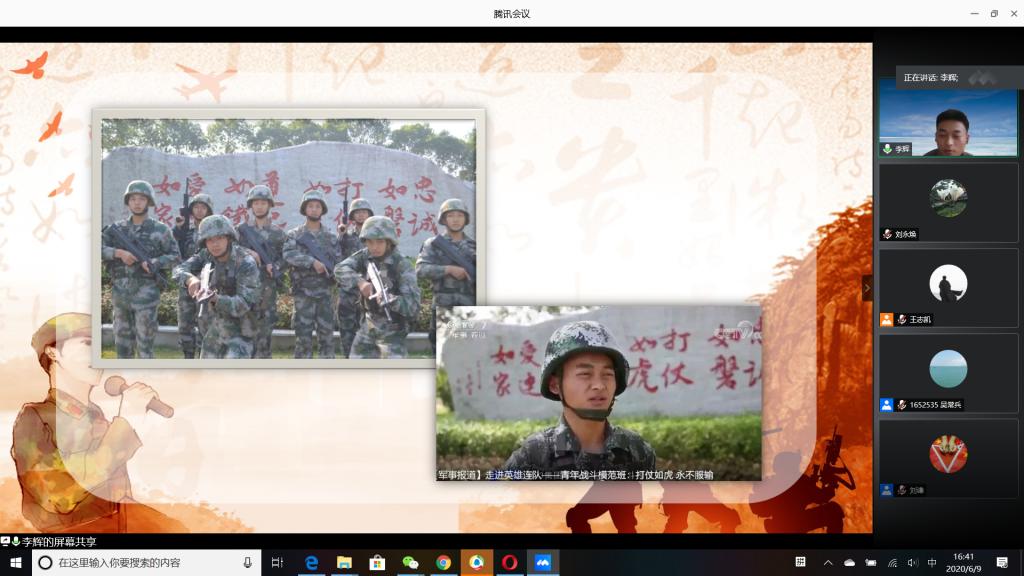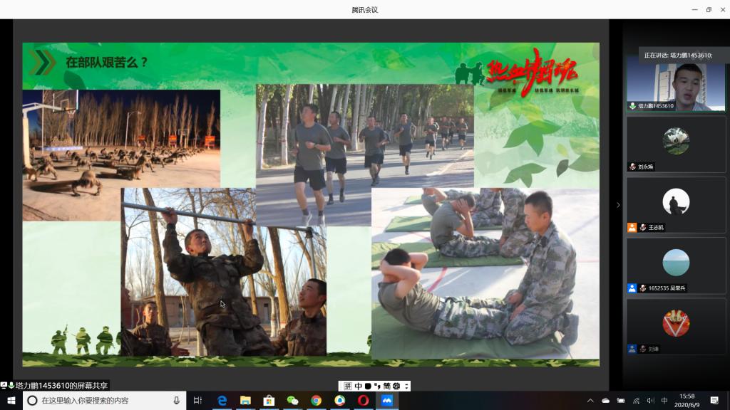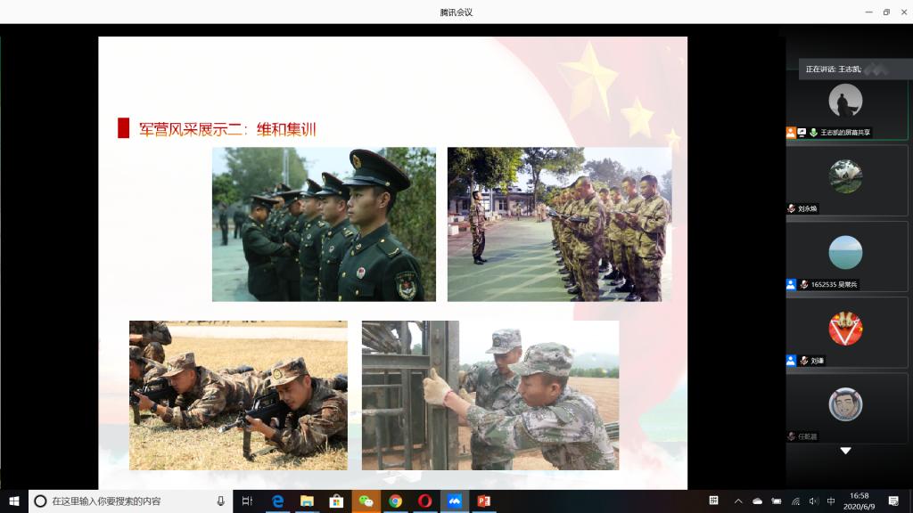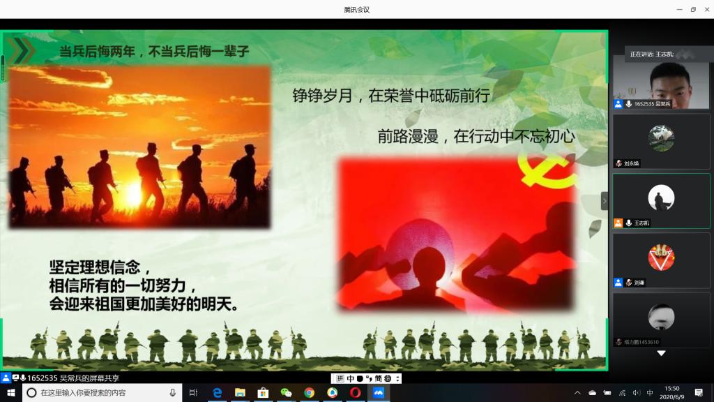 “国无防不立,民无兵不安”,巩固国防和强大军队是新时代坚持和发展中国特色社会主义、实现中华民族伟大复兴的战略支撑。6月9日下午,公司成功举办以“无迷彩,不青春”为主题的线上退伍老员工分享暨2020年征兵动员会,会议由公司退伍老员工王志凯主持,员工党总支副书记刘永焕、学工办主任刘谦、辅导员汤若琦、王秋晨和常恒以及有意向应征入伍的老员工参加了分享动员会。分享会上,来自四个公司的八名优秀退伍老员工从国防的意义及我国部队的发展与改革展开,结合自己的亲身经历,向参会的老员工分享了自己难忘的军旅生涯和参军故事,号召更多的有志青年,以强烈的政治意识和使命担当,携笔从戎,以实际行动积极支持和服务改革强军战略。