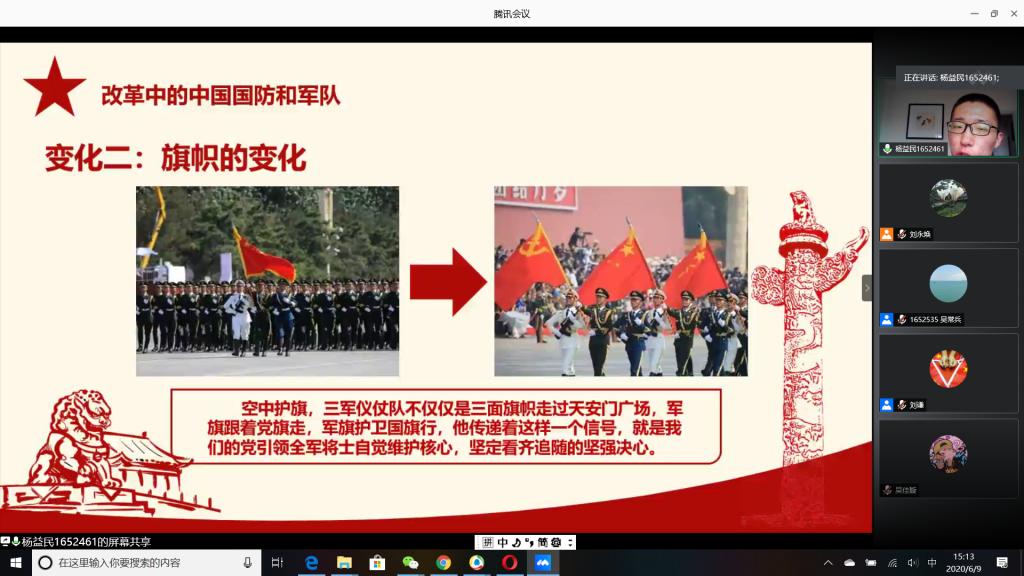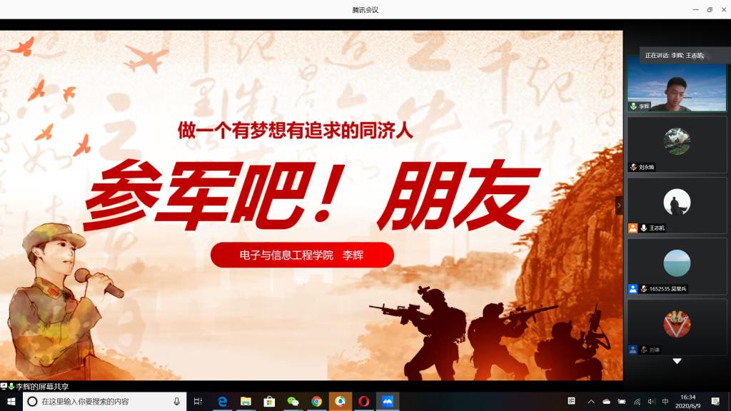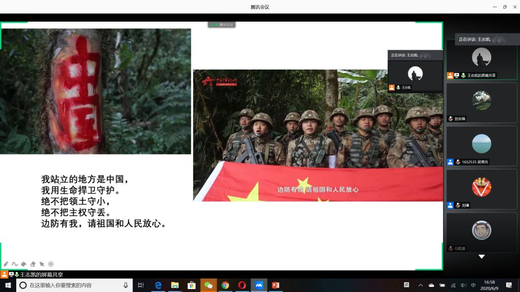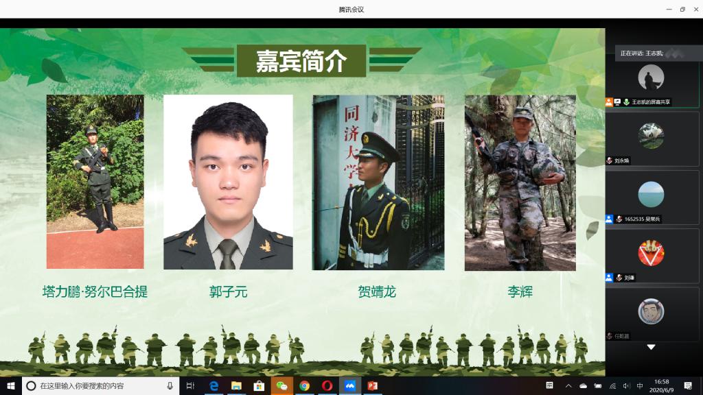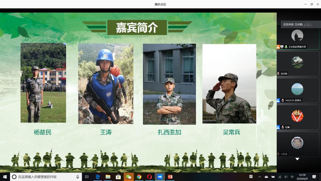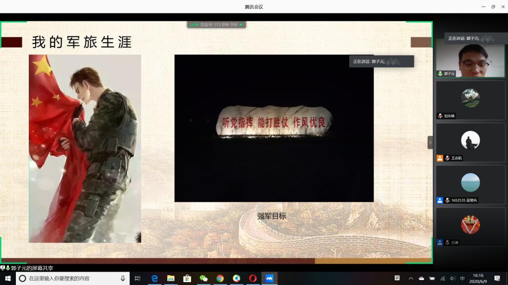 “国无防不立,民无兵不安”,巩固国防和强大军队是新时代坚持和发展中国特色社会主义、实现中华民族伟大复兴的战略支撑。6月9日下午,公司成功举办以“无迷彩,不青春”为主题的线上退伍老员工分享暨2020年征兵动员会,会议由公司退伍老员工王志凯主持,员工党总支副书记刘永焕、学工办主任刘谦、辅导员汤若琦、王秋晨和常恒以及有意向应征入伍的老员工参加了分享动员会。分享会上,来自四个公司的八名优秀退伍老员工从国防的意义及我国部队的发展与改革展开,结合自己的亲身经历,向参会的老员工分享了自己难忘的军旅生涯和参军故事,号召更多的有志青年,以强烈的政治意识和使命担当,携笔从戎,以实际行动积极支持和服务改革强军战略。