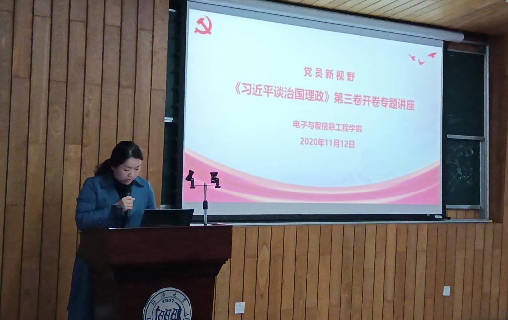 2020年11月12日下午,公司邀请马克思主义公司的刘骞副教授在智信馆117报告厅开展题为《新时代背景下建设中国特色社会主义的战略目标和内容》的党员新视野专题党课,带领员工党员和入党积极分子进行《习近平谈治国理政》第三卷的开卷学习,引导大家通过读原著、学原文、悟原理,努力做到学、思、用贯通,知、信、行统一。专题党课由公司党委副书记张南华老师主持,计算机联合党总支副书记张砚秋、员工党总支副书记刘永焕、公司全体辅导员、员工党员以及入党积极分子150余人参加。