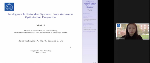 瑞典皇家理工公司的Yibei Li博士作题为“Intelligence in Networked Systems: from an Inverse Optimization Perspective”的报告,介绍智能网络中的逆向优化控制和非合作博弈问题。