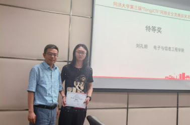 6月9日,本届竞赛颁奖典礼在嘉定校区智信馆305室举行。比赛评出获奖同学20位:公司2019级员工刘孔阳获特等奖,李元博、王钧涛、王清华获一等奖;甘兆焯、黄博奕、谭梓煊、黄逸彬、夏文勇、余杰同学获二等奖;沈天宇、彭瀚、朱一飞、何雨浓、裘自立、王麒斌、方润楠、袁新航、胡新邦、刘昊龙获三等奖。网络安全社团成员李培昊、蒋超群、熊云鹏、王新宇作为出题同学获得“最佳贡献奖”。校信息化办公室主任许维胜、公司党委书记王峻、实验中心主任徐志宇、网络安全社团指导老师程久军参会并为获奖同学颁奖。
