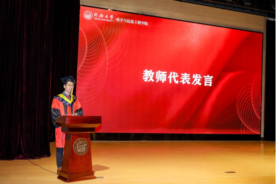 教师代表邱雷教授回顾12年前本科毕业时的情景,分享了三点感悟:首先要有“人品”,愿同学们时刻保有一颗赤子之心,抵得住诱惑,不要让无价的人品与信用,变得有价。其次要有“格局”,职业的路、人生的路要做长远的规划。最后,他强调,同学们要有好的“心态”,办法总比困难多。