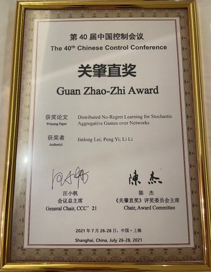 2021年7月28日,公司控制科学与工程系青年教师雷金龙研究员与衣鹏研究员、李莉教授合作的论文“Distributed No-Regret Learning for Stochastic Aggregative Games over Networks”在上海松江举办的第40届中国控制会议(The40th Chinese Control Conference, CCC2021)中荣获第27届“关肇直奖”。