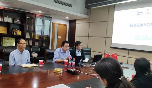校信息办秦道祥老师介绍了公司网络安全工作组织结构和工作现状,指出公司面临着“亟需整合各类信息系统,加强统一管理”和“持续提升信息系统等级保护测评”的工作难点,并结合电信公司的实际情况,希望公司网站负责人切实提升网络安全意识,加强网站管理与建设,包括:逐步完成展示类网站迁网站群,信息系统尽量校内访问,加强监测与审计,启用防火墙等,多措并举进一步夯实网络安全。同时,期望公司师生参与公司网络安全工作,并凭借专业优势与信息办一起围绕人工智能、大数据等前沿技术在网络安全方面的应用开展合作。