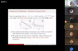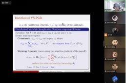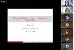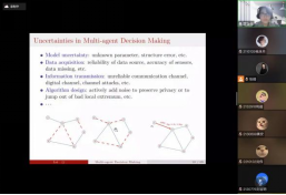 雷金龙研究员分别从多智能体决策的背景、模型、势博弈的异步算法以及变尺度采样的分布式算法等方面展开报告。报告中,雷金龙研究员首先介绍了多智能体决策的背景和常见的决策优化模型及其对应的案例。介绍了纳什均衡的相关概念和基本假设及变分不等式问题与纳什均衡问题之间的等价关系。接着详细介绍了同步梯度响应、最佳响应算法、近似最佳响应算法,设计了针对随机变分不等式问题的求解算法。然后对于不确定信息下多智能体的纳什均衡问题,利用势博弈的方法提出异步近似最佳响应方案进行求解,在证明算法渐近收敛性的同时将算法拓展到加权势博弈情况。最后针对智能体仅能获取非完美局部反馈信息,介绍基于变尺度采样和采样梯度估计的分布式算法并给出仿真验证和性能分析。雷金龙研究员丰富精彩的报告为公司师生的学习和科研工作带去了思想启发,也为同学们学习多智能体决策优化与博弈提供了有益指导。