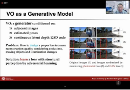 查红彬教授分别从SLAM的概念、研究进程、关键问题以及在线学习方案等方面展开报告。首先,查教授介绍了SLAM中定位与建图的耦合关系,并表示同步定位与建图是人类动态视觉系统的一个基本功能。然后介绍了SLAM研究的历史发展及一些相关的算法,详细分析目前SLAM算法的一些不足并指出关键问题是系统性表述的缺乏。接着介绍了传感器数据流的关键概念、预测器和地图的相关概念和在线学习方案。查教授还介绍了所在团队与SLAM相关的一些研究。最后详细地介绍了一项其团队的近期研究工作,是基于序贯对抗学习的自监督深度视觉测距,包括视觉测距的背景、基于学习的方法、存在的挑战以及该工作主要贡献和实验结果等。查教授丰富精彩的报告为公司师生的学习和科研工作带去了思想启发,也为同学们学习动态视觉与SLAM提供了有益指导。