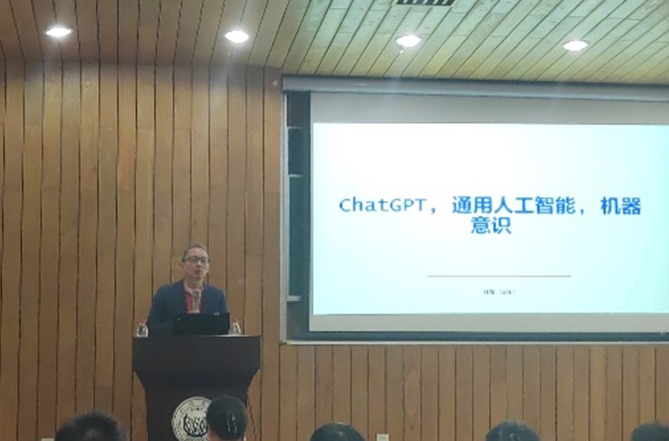 5月23日下午,由公司、上海自主智能无人系统科学中心联合举办的智·信讲堂校庆系列特活动第50期在智信馆117报告厅开讲。本次讲堂邀请到了伦敦大学公司、上海数字大脑研究院汪军教授作“ChatGPT,通用人工智能和机器意识”主题报告,由张皓教授主持。