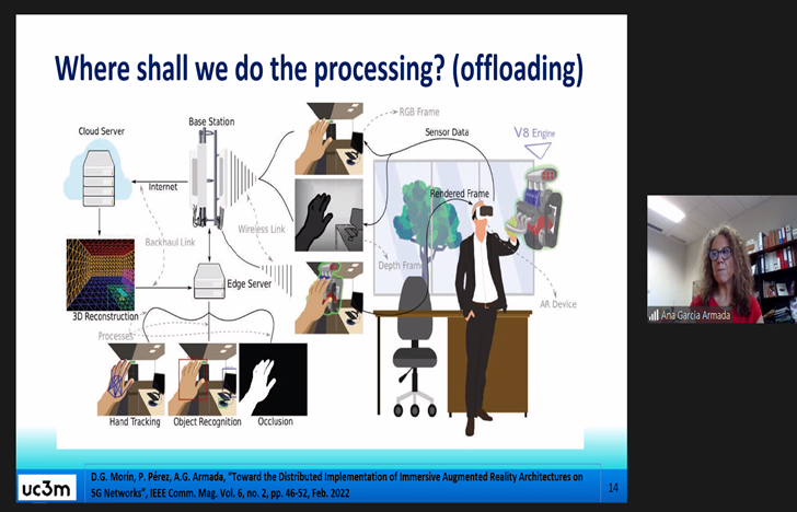 首先,Ana García Armada教授介绍了至今为止移动通信的发展历程和现状。然后,她以5G新无线电为出发点,详细介绍了5G网络的主要新功能,并指出这些功能正在实现虚拟和增强现实服务方面产生实质性的技术飞跃。接着,Ana García Armada教授通过一个在养老院提供基于虚拟现实的沉浸式音乐治疗项目(AMATISTA)为例详细地分析了上述技术的现状并指出其应用方法和优缺点。最后,Ana García Armada教授指出虚拟和增强现实技术在未来会出现新的交互方式(如增加触觉维度),而这些交互的实现则需要移动通信网络提供新的功能,并且这些功能在移动通信网络向6G演进的过程中将会发挥重要作用。