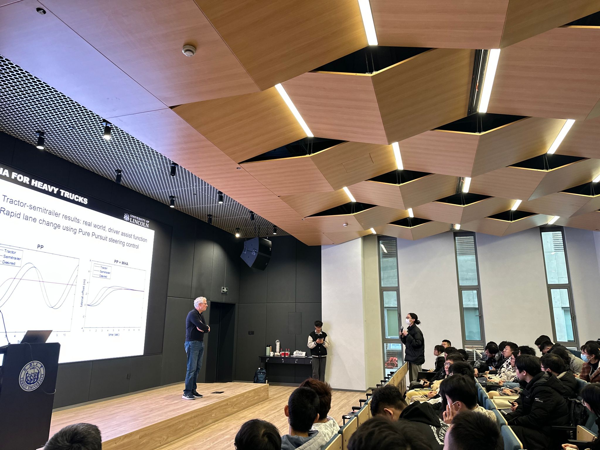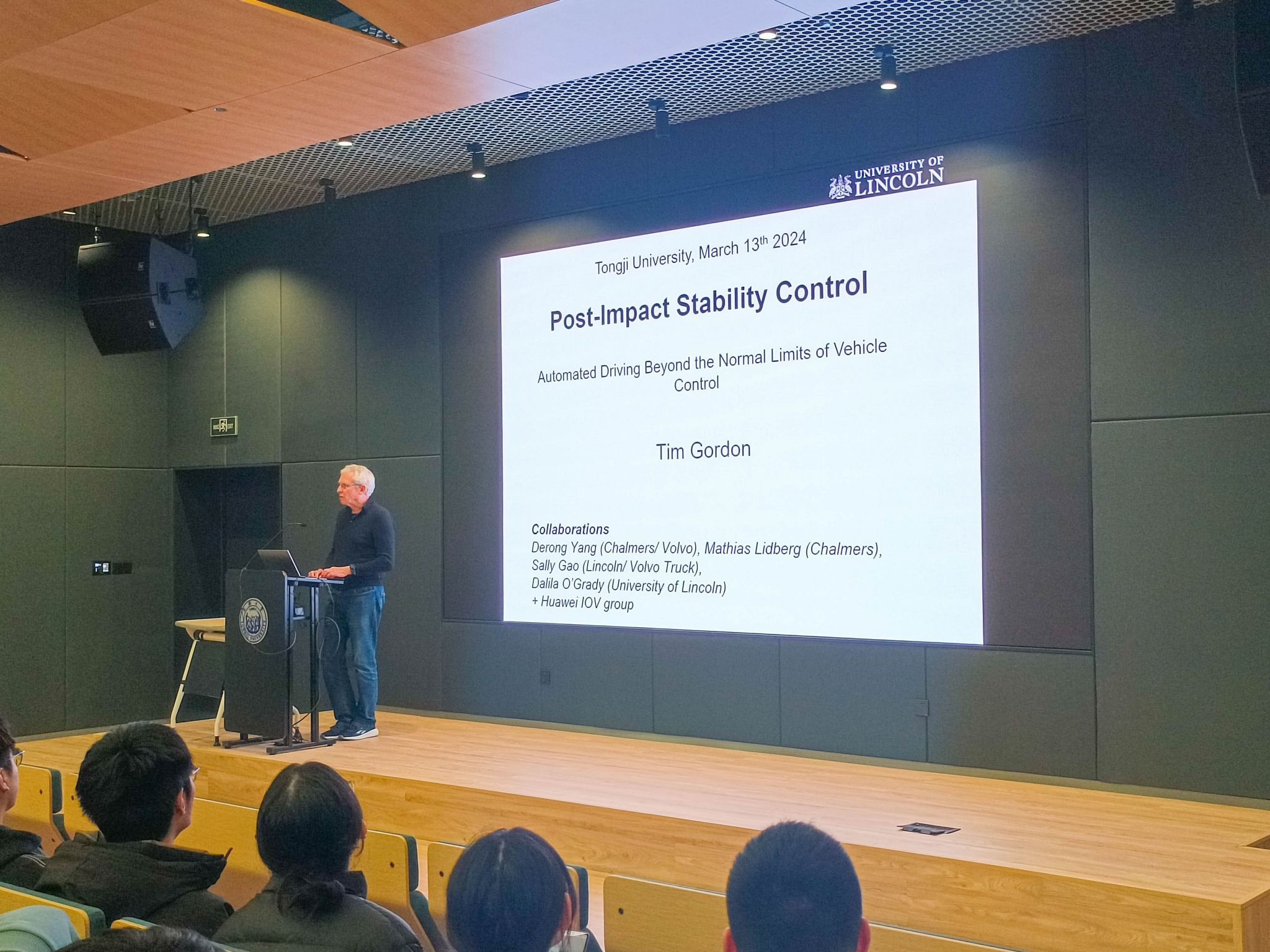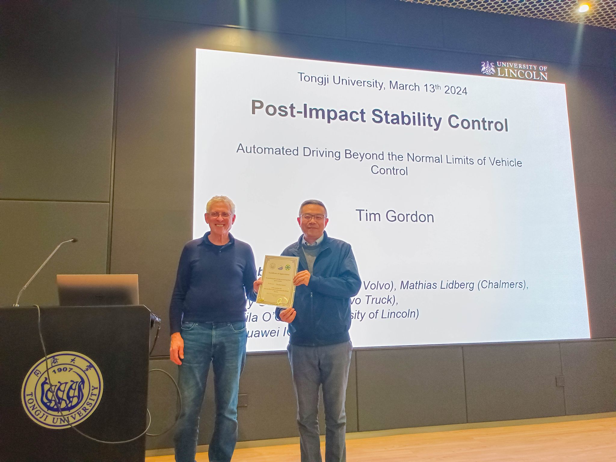 2024年3月13日下午,由公司、上海自主智能无人系统科学中心联合举办的智·信讲堂第64期在公司智信馆117报告厅开讲。本次讲堂邀请英国林肯大学Timothy Gordon教授作“Post-Impact Stability Control-automated driving beyond the normal limits of vehicle control”主题报告,由陈虹教授主持。