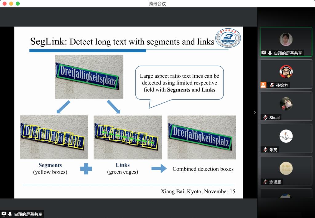白翔教授的报告题目为“场景文本检测与识别”,并针对不规则文本检测做了详细介绍和分析。在本次报告中,白翔教授照例介绍了文本检测的发展历史、研究意义和主要思路。在后面的详细介绍部分,针对多个解决思路,从检测和识别的两个部分,详细介绍了多篇论文中的方法。在不规则文本检测部分,针对密集文本、弯曲文本等问题进行了讲解。虽然报告在线上举行,但是仍旧取得了良好效果,诸多该领域的最新进展使同学们感到新颖、有趣,并加深和拓展师生的理论理解和学术视野。报告后听众与专家进行了热烈的讨论。