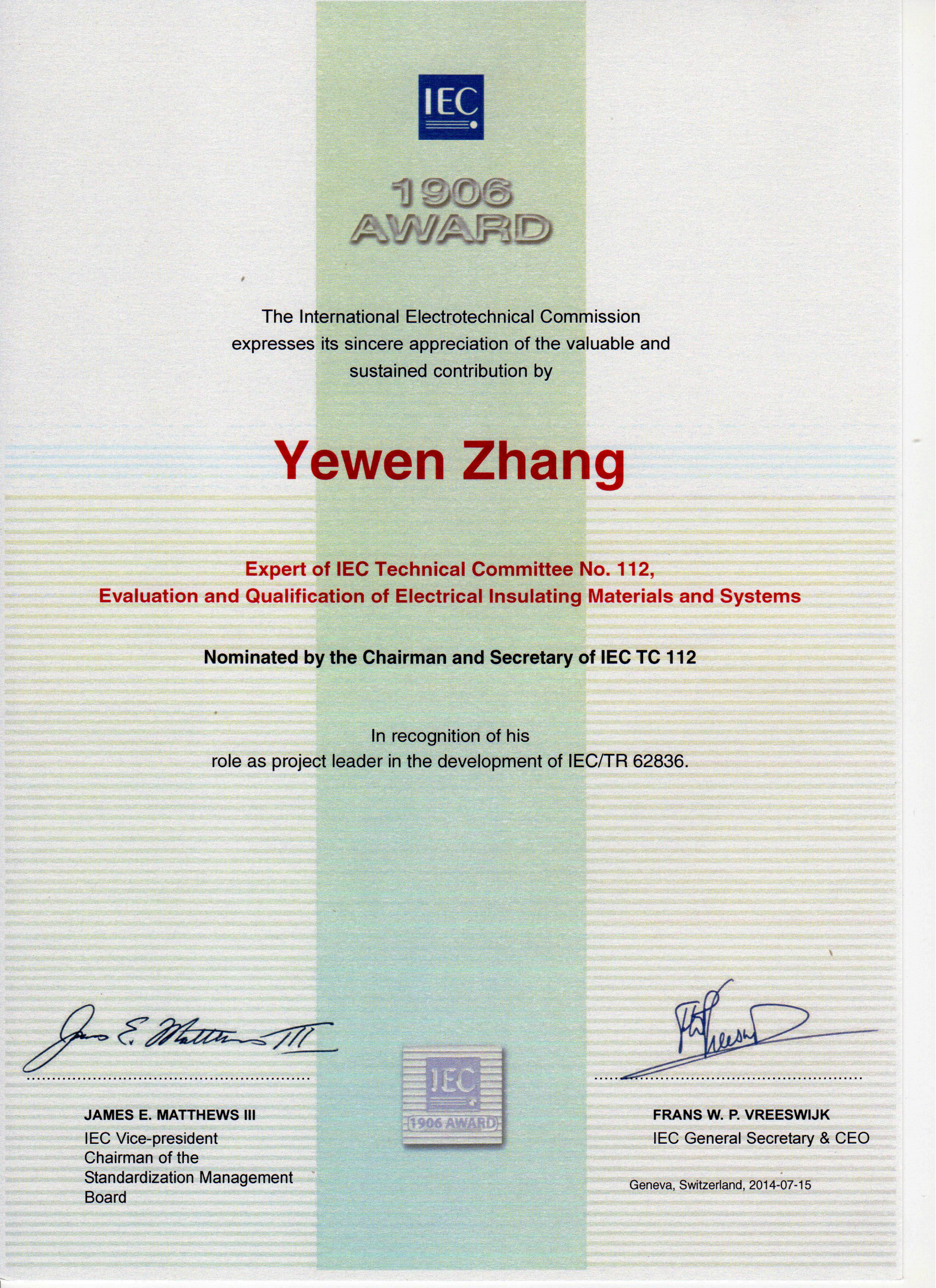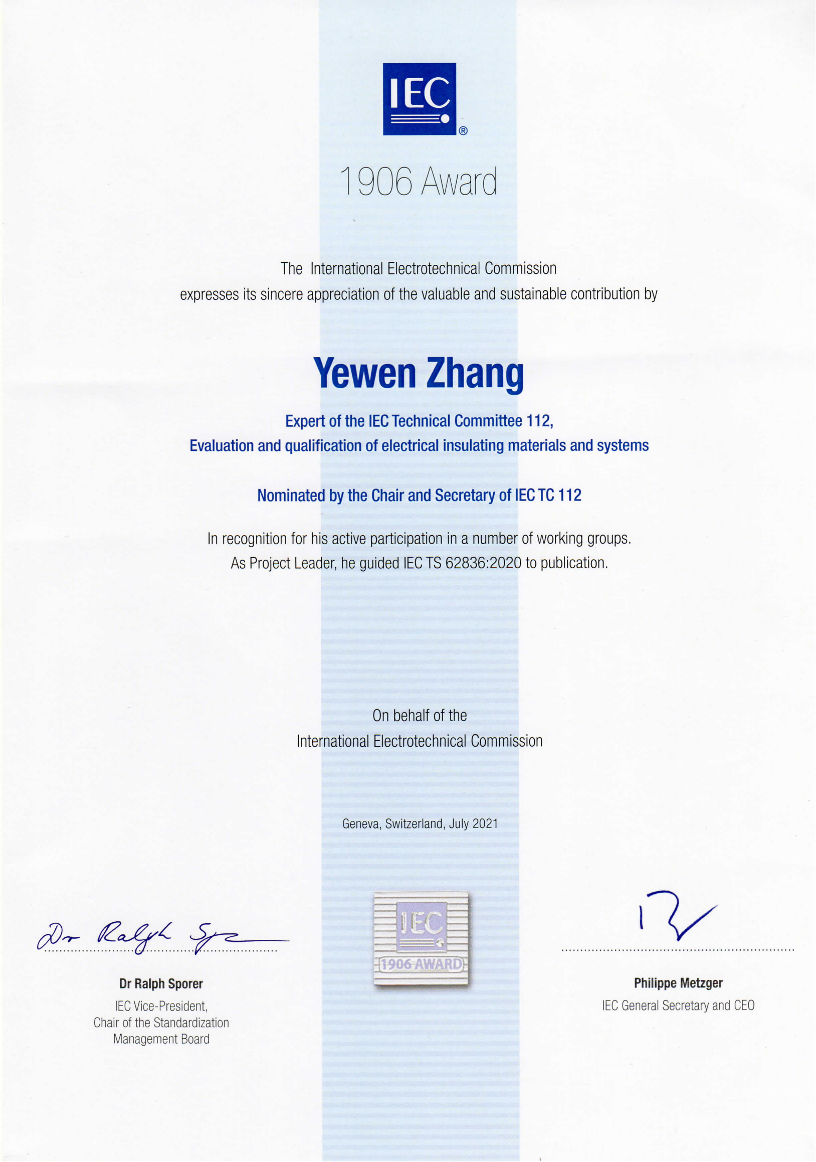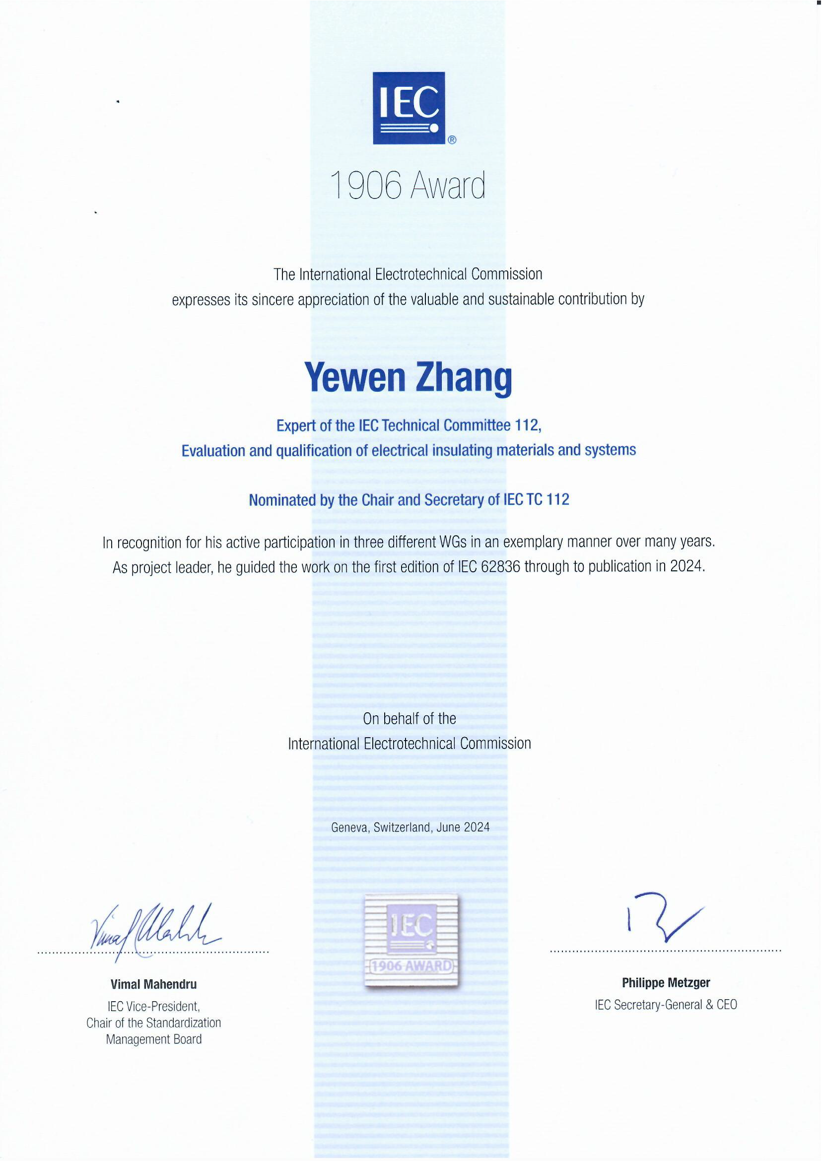 近日,国际电工委员会(IEC)公布了2024年度“IEC 1906奖”获奖名单,公司张冶文教授再度获此殊荣,实现了“三连冠”。