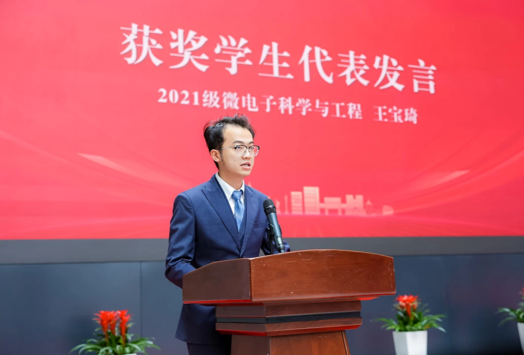 获奖员工代表2021级微电子科学与工程专业本科生王宝琦发言。他首先代表所有获奖同学向吴启迪教授、乔非教授、各位员工和老师致以崇高的敬意和由衷的感谢。他表示,启迪奖学金不仅引领青年学子在专业领域不断探索和创新,激发追求卓越、勇于挑战的精神,更能激励大家在未来的学习和工作中以更大的热情和决心投身于实践。生逢中华民族发展最好时期的青年学子,当以“制出将来之少年中国”为己任,以真才实学攻克“卡脖子”技术难关,积极弘扬启迪奖学金的精神,担时代之责,承报国之行,与公司同呼吸、共进步。