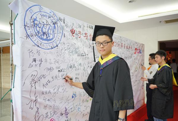 会场入口处,毕业生们纷纷以走红地毯的形式入场,并在签名墙上留字、合影。红毯两侧的展板上,摆设的是同学们评选出的“最受欢迎的专业教师”给毕业生的寄语和各毕业生班级展示。