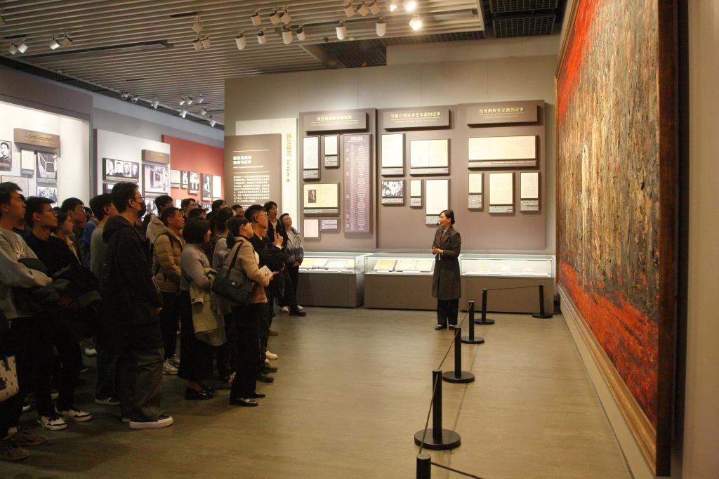 在中共一大会址纪念馆内,随着一幅热血澎湃的历史画卷徐徐展开,同志们仿佛身临其境,深切感受到革命光辉历程的振奋人心。“日出东方——从石库门到天安门”历史组画照壁宏伟而壮丽,在这激情洋溢的历史画卷前,同志们沿着中国共产党100余载的光辉历程,共同回忆中国共产党从建立到发展的开天辟地的大事变。