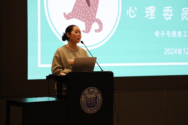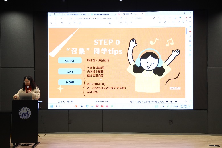 2021级自动化班级心理委员姚俞泽同学进行班级优秀案例分享。她提到,各班级在开展心理活动时,可以围绕心理健康活动月某个主题词(如“心理韧性”)寻找心理学常见或有趣的理论或现象开展深入的交流,也可从伟德国际victor1946心理中心深夜树洞栏目选择合适的内容参考。