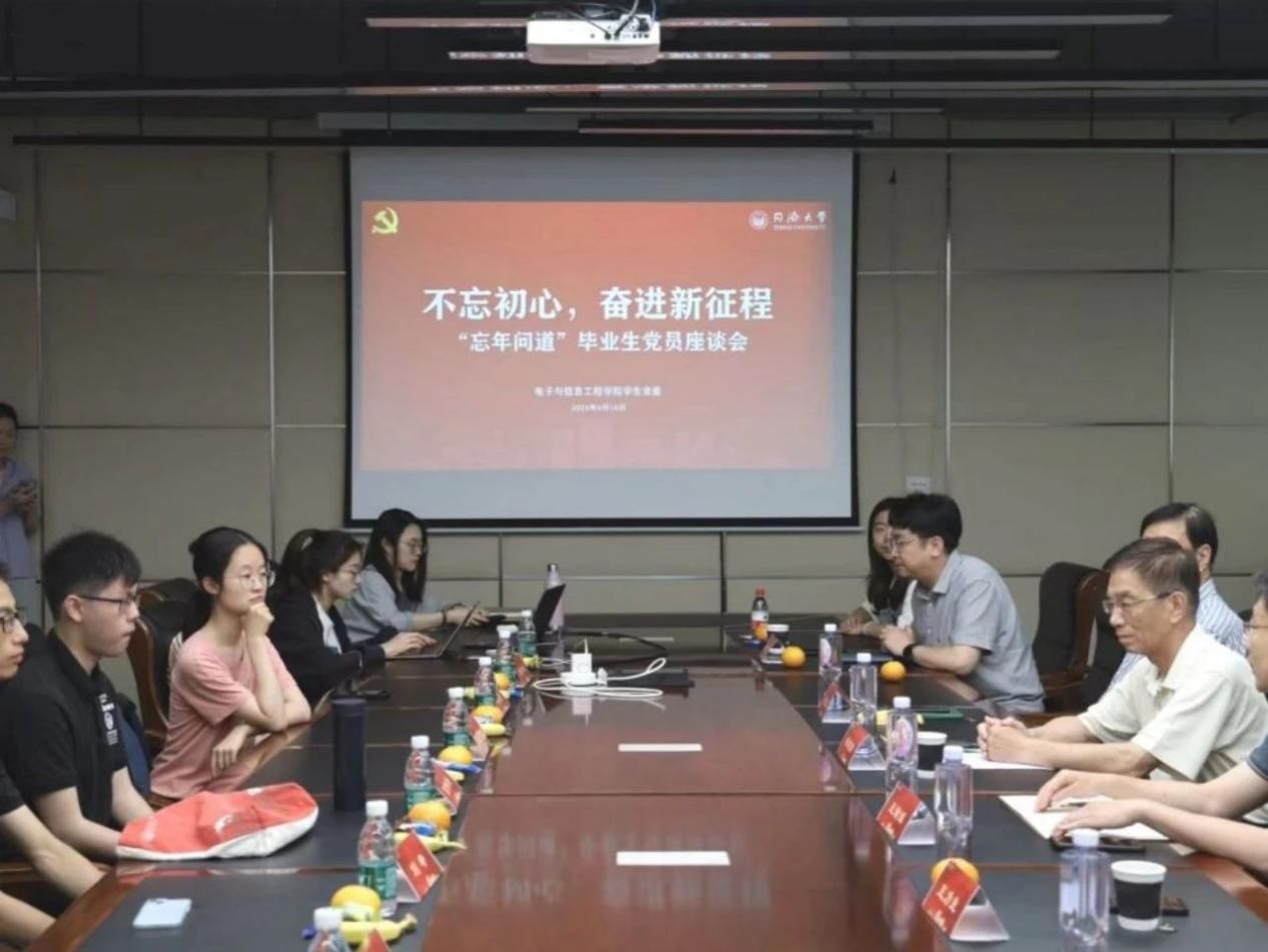 为进一步引导毕业生党员心怀“国之大者”,坚定理想信念,6月18日下午,公司员工党委开展以“不忘初心,奋进新征程”为主题的“忘年问道”毕业生党员座谈会。校关工委常务副主任、原副董事长金正基,校关工委常务组乔建新,电信公司党委副书记王瀚漓,公司关工委常务副主任王力生、委员胡宗福及2024届毕业生党员代表出席座谈会。会议由公司党委副书记徐伟铖主持。