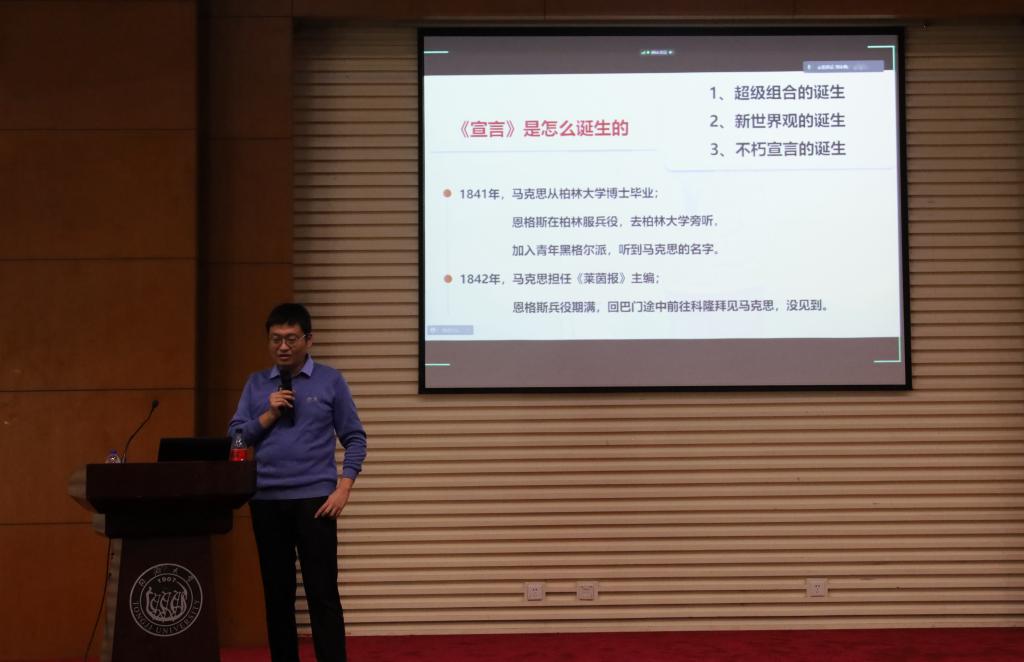 肖鹏老师介绍,在《宣言》写作过程中还经历了一段小插曲。最初由恩格斯起草的《宣言》草稿是问答的形式,马克思认为问答的形式拉开了与工人阶级之间的距离感。两人商定后,最终由马克思定稿为更具感染力与号召力的文学形式。《宣言》一经问世,便为世界工人运动浪潮注入了一剂强心剂,也直接拉开了史无前例的欧洲大革命序幕。时至今日,这部《宣言》依然是每一名共产党员的必读书目,依然闪烁着真理的光芒。