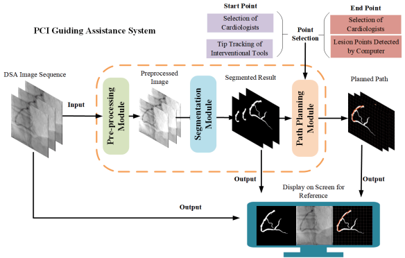 在冠心病诊断中,经皮冠状动脉介入手术(PCI)所生成的DSA图像是“金标准”,然而由于光照变化、成像角度以及组织干扰等各种因素的影响,有时会使得DSA成像品质欠佳,其中的血管结构展示不清。面对复杂的人体血管结构,不论是医生还是智能手术机器人系统,都需要实现手术决策规划,确定介入器械如何到达指定目标部位。