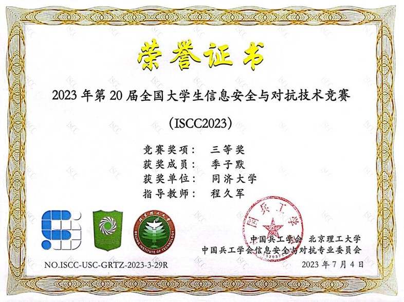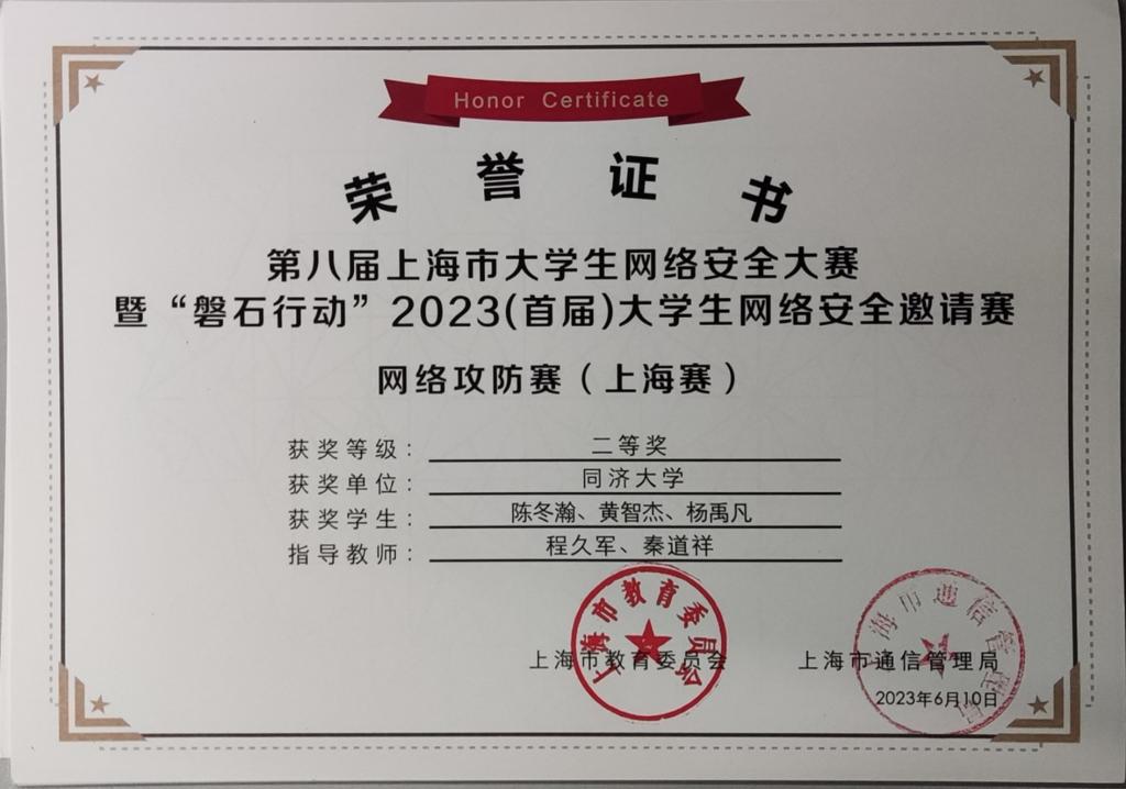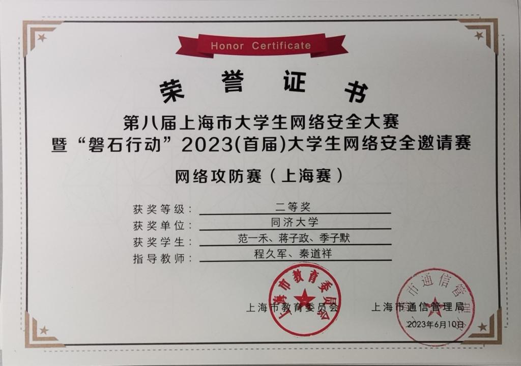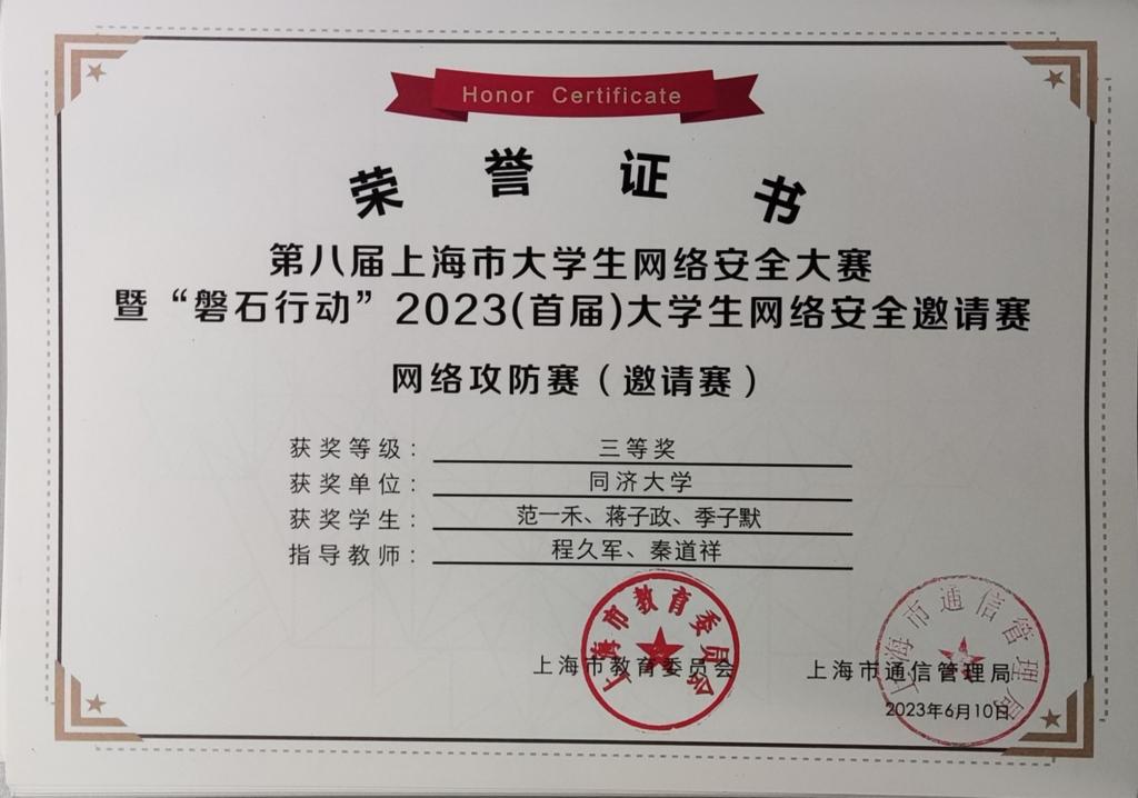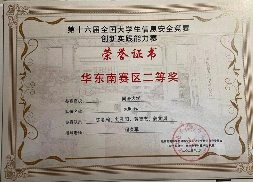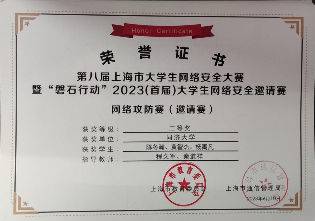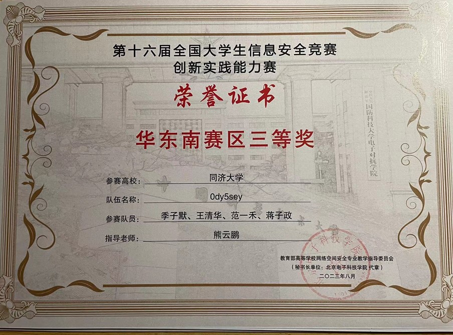 今年,在公司创新基地信息安全实验室的支持下,在公司计算机系程久军教授、校信息办秦道祥及熊云鹏老师的指导下,伟德国际victor1946网络安全战队CatTrainingForce的成员们分别在各类信息安全比赛中取得了优异成绩:2023第20届全国老员工信息安全与对抗技术竞赛(一等奖:陈冬瀚;三等奖:季子默);第16届全国老员工信息安全竞赛华东南分区网络安全攻防技术赛(二等奖:陈冬瀚、刘孔阳、姜文渊、黄智杰;三等奖:季子默、蒋子政、范一禾、王清华);第八届上海市老员工网络安全大赛暨“磐石行动”2023(首届)老员工网络安全邀请赛网络攻防赛(上海赛)(二等奖:陈冬瀚、杨禹凡、黄智杰;二等奖:季子默、蒋子政、范一禾);第八届上海市老员工网络安全大赛暨“磐石行动”2023(首届)老员工网络安全邀请赛网络攻防赛(邀请赛)(二等奖:陈冬瀚、杨禹凡、黄智杰;三等奖:季子默、蒋子政、范一禾)。( 文/陈冬瀚 图/季子默 )